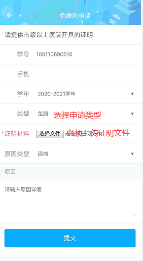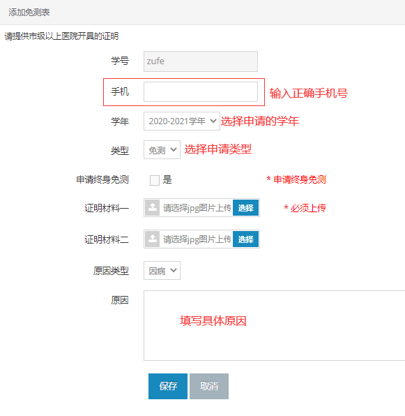 步骤四:按照要求填写相关信息,在类型里选择是免测或缓测,并上传证明材料,填写具体原因,点击保存等待审批即可。