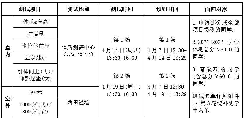 2021-2022学年学生健康测试总体安排,我校2021-2022学年学生体质健康测试缓补测工作将于近期开展,具体通知如下:
