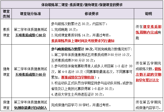 为落实体质健康促进工程,加强课余体育锻炼管理,经研究决定于2025-2026学年第一学期【第3-16周】开展课余体育锻炼。课余体育锻炼占【体育课程】总成绩18分,且为【体育锻炼】第二课堂素质课堂的必选内容及健身课堂的自选内容,须在课外完成锻炼,望各学院、各班级组织同学仔细查看以下内容,积极参加。